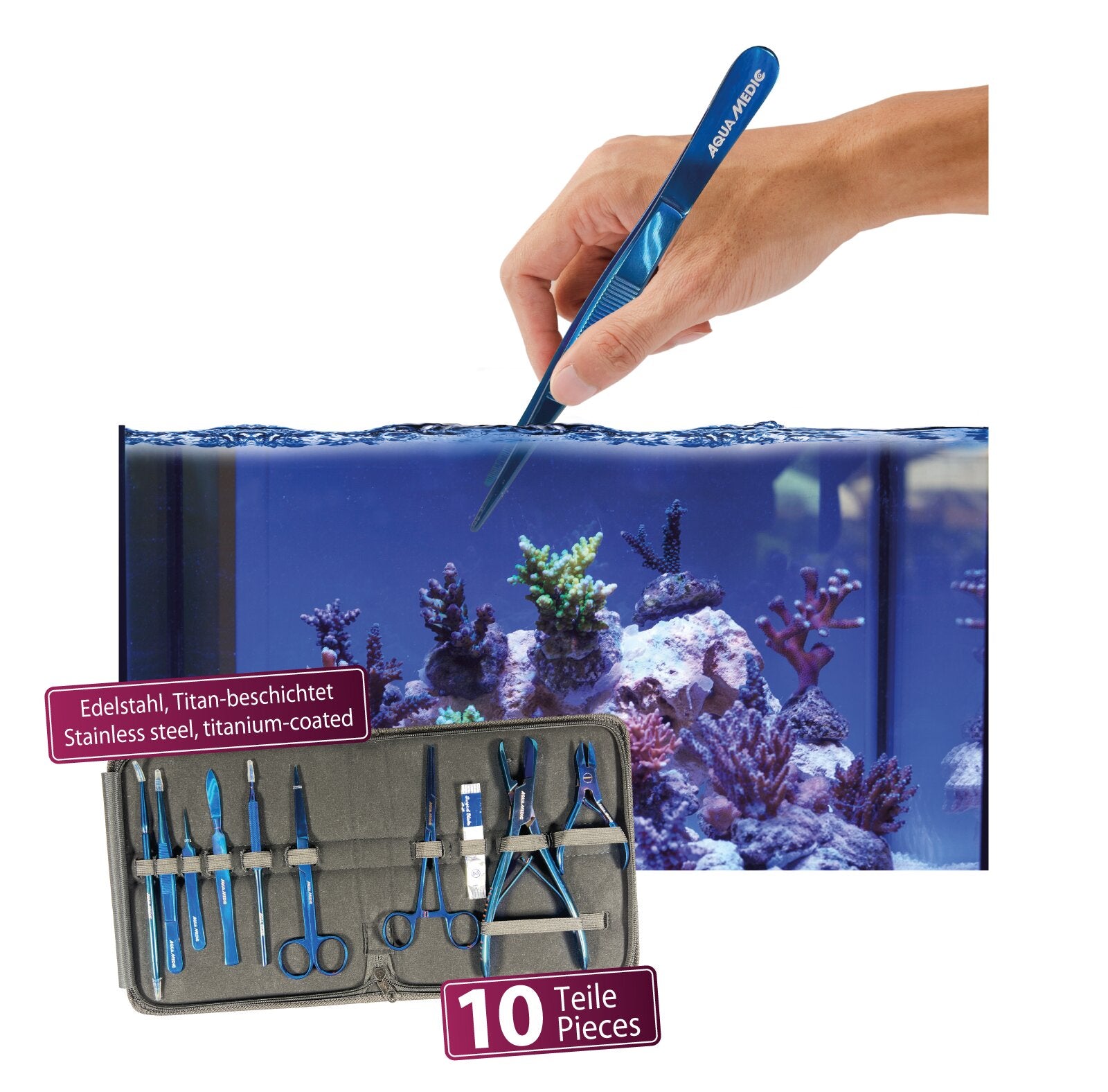 Avec notre set d'outils de 10 pièces en acier de première qualité, tu es parfaitement équipé pour la création artistique de ton aquarium. Le revêtement en titane bleu assure une grande longévité et rend les outils encore plus résistants à la rouille qu'une simple surface en acier inoxydable. Notre sélection de ciseaux, de pinces, d'outils de coupe et de dressage ainsi que de pincettes te permet de façonner et d'entretenir ton paysage sous-marin comme tu le souhaites.