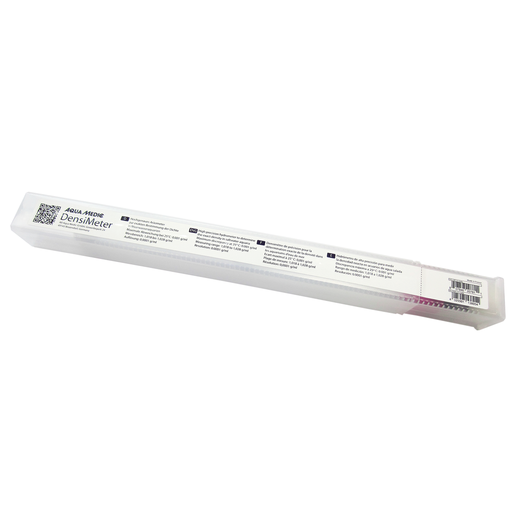 Densimètre destiné à la mesure de la densité [g/ml] - Tp. 25/4 °C dans les aquariums d'eau de mer. Pour une mesure très précise, laisser le densimètre flotter librement dans un récipient assez haut. La température de l'échantillon d'eau doit se situer dans la mesure du possible à 25 °C.