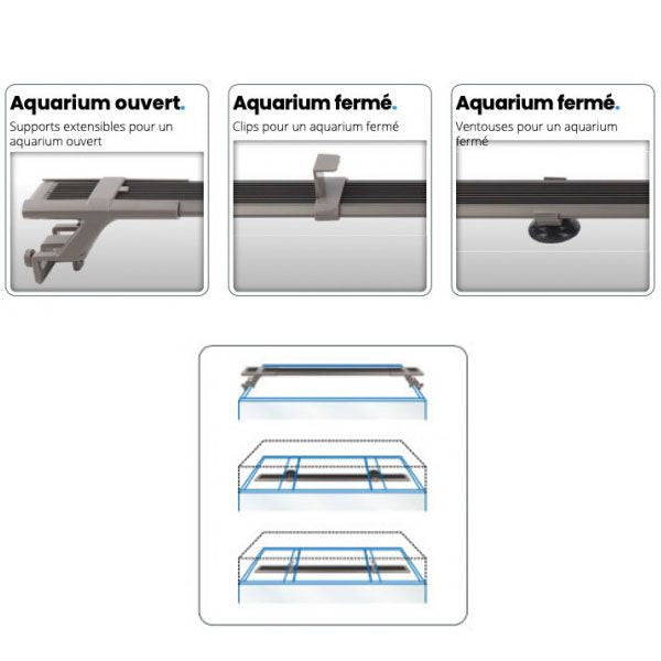 Montage pratique avec des supports extensibles en plastique pour les aquariums ouverts, ou avec des clips ou des ventouses pour les aquariums fermés.
