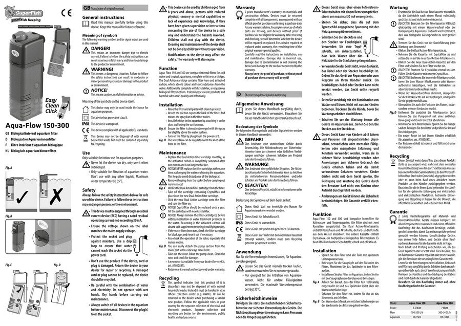 | Consommation électrique 3,5 W, débit 200 L/h pour les aquariums jusqu'à 150 litres. Remplacez la cartouche filtrante une fois par mois pour un fonctionnement optimal. |